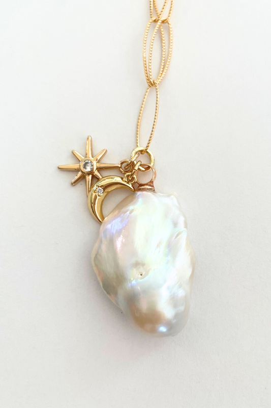 Flameball XL Baroque Pearl Gold Long Marquise 34" Necklace w/charms